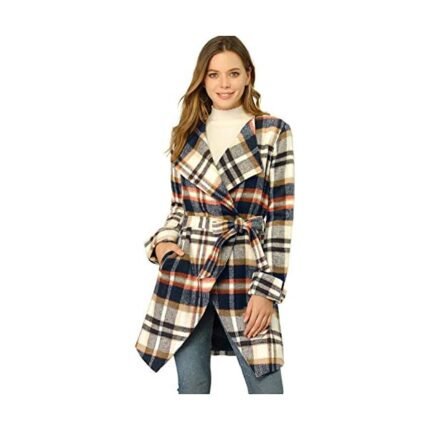 Women’s Plaid Belted Wrap Overcoat Shawl Collar Asymmetric Hem Fall Winter Coat